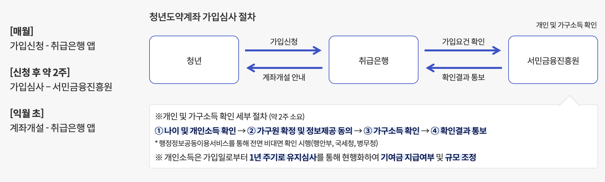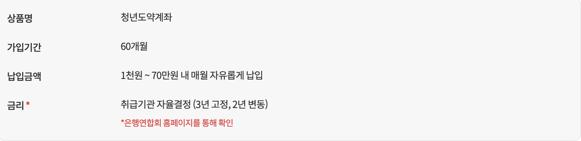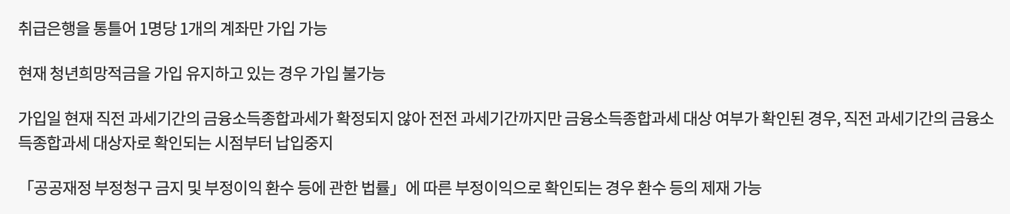 ※ 청년도약계좌는 정부기여금(공공재정지급금)이 지급되는 상품으로, 거짓된 정보로 부정청구를 하는 경우 「공공재정환수법」에 따라 정부기여금이 환수되며 제재부가금이 부과될 수 있습니다.