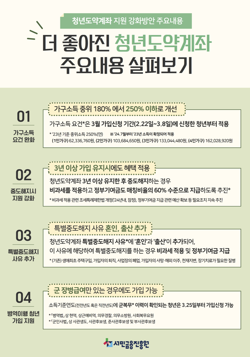 금융당국은 26일, 내년 1월부터 청년도약계좌의 월 기여금 지원을 최대 3만3000원으로 확대한다고 발표했습니다. 5년 동안 받을 수 있는 정부 지원금은 최대 198만원에 이릅니다. 이 혜택은 기존 가입자와 신규 가입자 모두에게 적용됩니다.