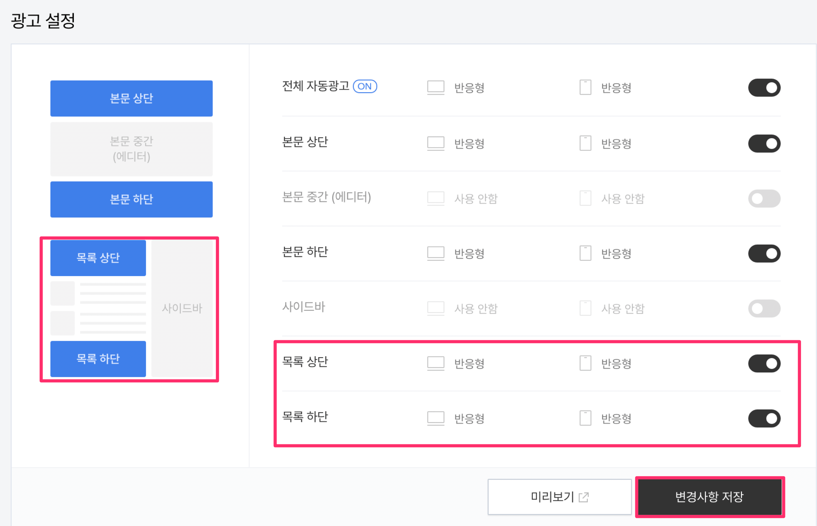 2. 애드센스 관리 페이지에서 목록 상단/하단 광고 설정이 활성화되었는지 확인