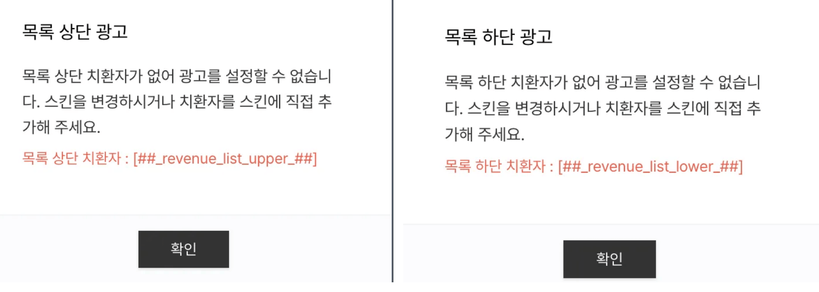 3. '목록 상단'과 '목록 하단' 켜기를 각각 클릭하여 치환자 코드 확인