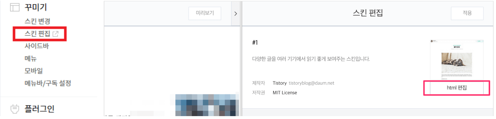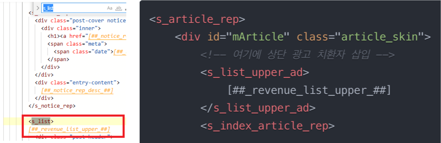 이제 블로그 스킨에 치환자 코드를 삽입할 차례입니다.