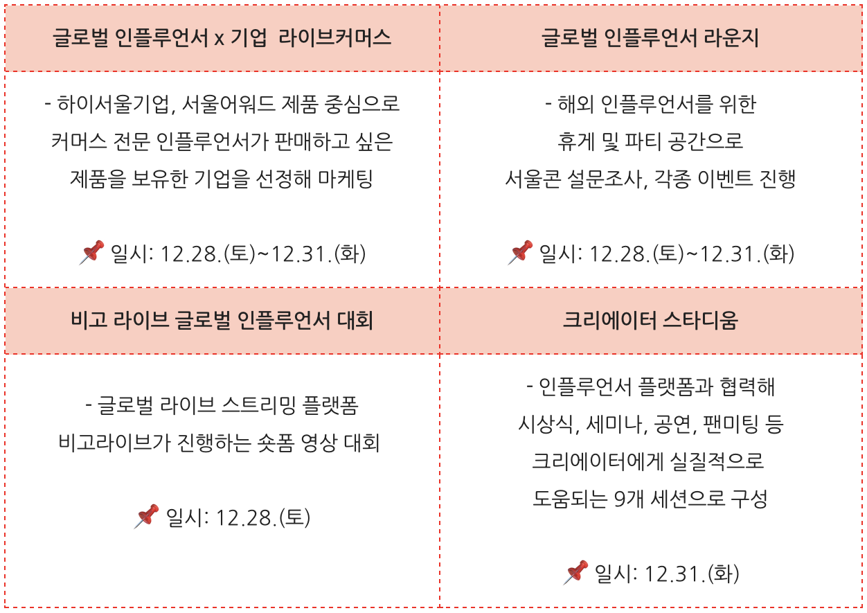 - 글로벌 인플루언서가 K-POP, K-뷰티, K-패션 등 서울의 다양한 라이프스타일을 세계에 알립니다.