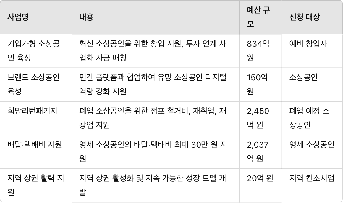 이번 2025년 지원사업은 소상공인들이 경영 부담을 덜고, 새로운 도약을 할 수 있도록 다양한 지원책을 포함하고 있습니다. 특히 디지털 전환과 글로벌 진출을 꿈꾸는 소상공인들에게 좋은 기회가 될 것입니다!